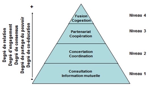Ces types d’activités de collaboration école-famille influencent le degré de relation entre le personnel enseignant et les parents d’élèves. Par exemple, l’envoi d’un mot dans l’agenda de l’enfant représente un degré plus faible d’engagement entre les partenaires qu’une concertation pour l’obtention de services spécialisés. Ainsi, selon Larivée (2008, p. 223)[2], les activités de collaboration varient en fonction du degré d’engagement des partenaires. Il détermine quatre niveaux : de la consultation à l’information mutuelle; de la concertation à la coordination; du partenariat à la coopération; et de la gestion à la cogestion.