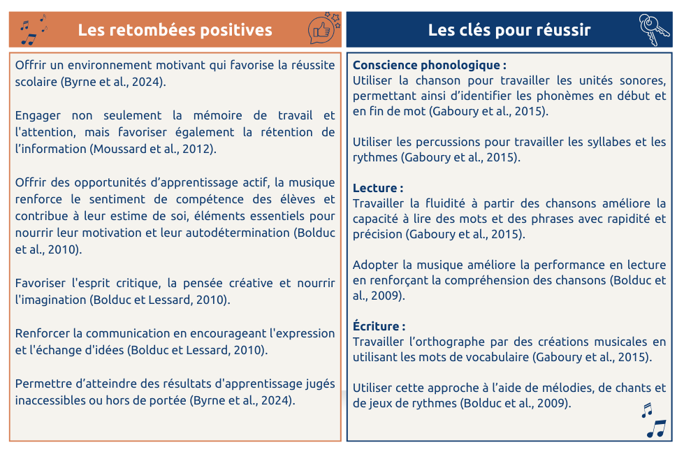Voici un tableau qui met en lumière les effets de l’apprentissage par la musique et les clés pour le mettre en œuvre avec succès.