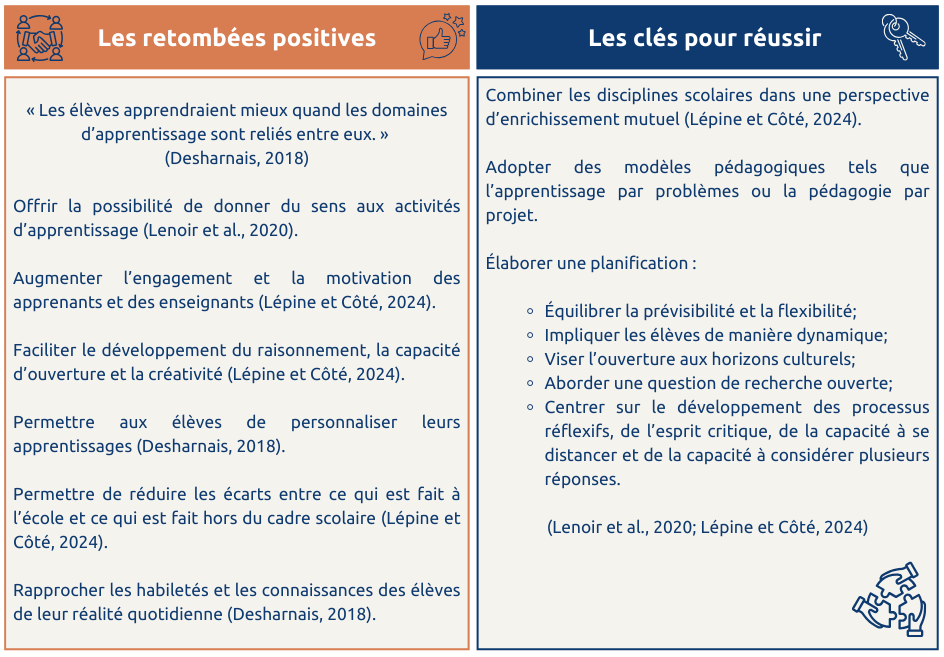 Dans cette optique, le tableau suivant présente les effets de l’apprentissage interdisciplinaire ainsi que les éléments clés pour une mise en œuvre réussie.