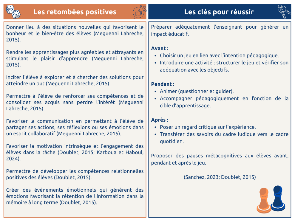Le tableau suivant expose les effets de l’apprentissage par le jeu et ses conditions de réussite.