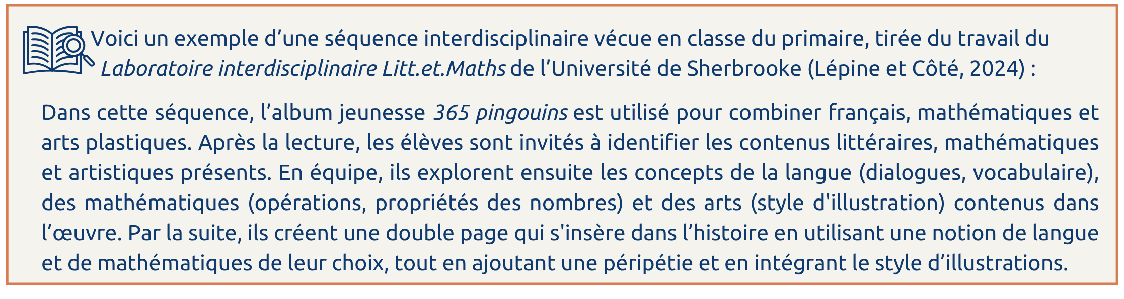 Côté, L. et Lépine, M. (2024). Adopter une perspective interdisciplinaire lors de la planification des apprentissages des élèves et de l’enseignement. Dans S. Viola et E. Tremblay-Wragg (dir.) Passeport pour la planification au primaire. Éditions JFD.