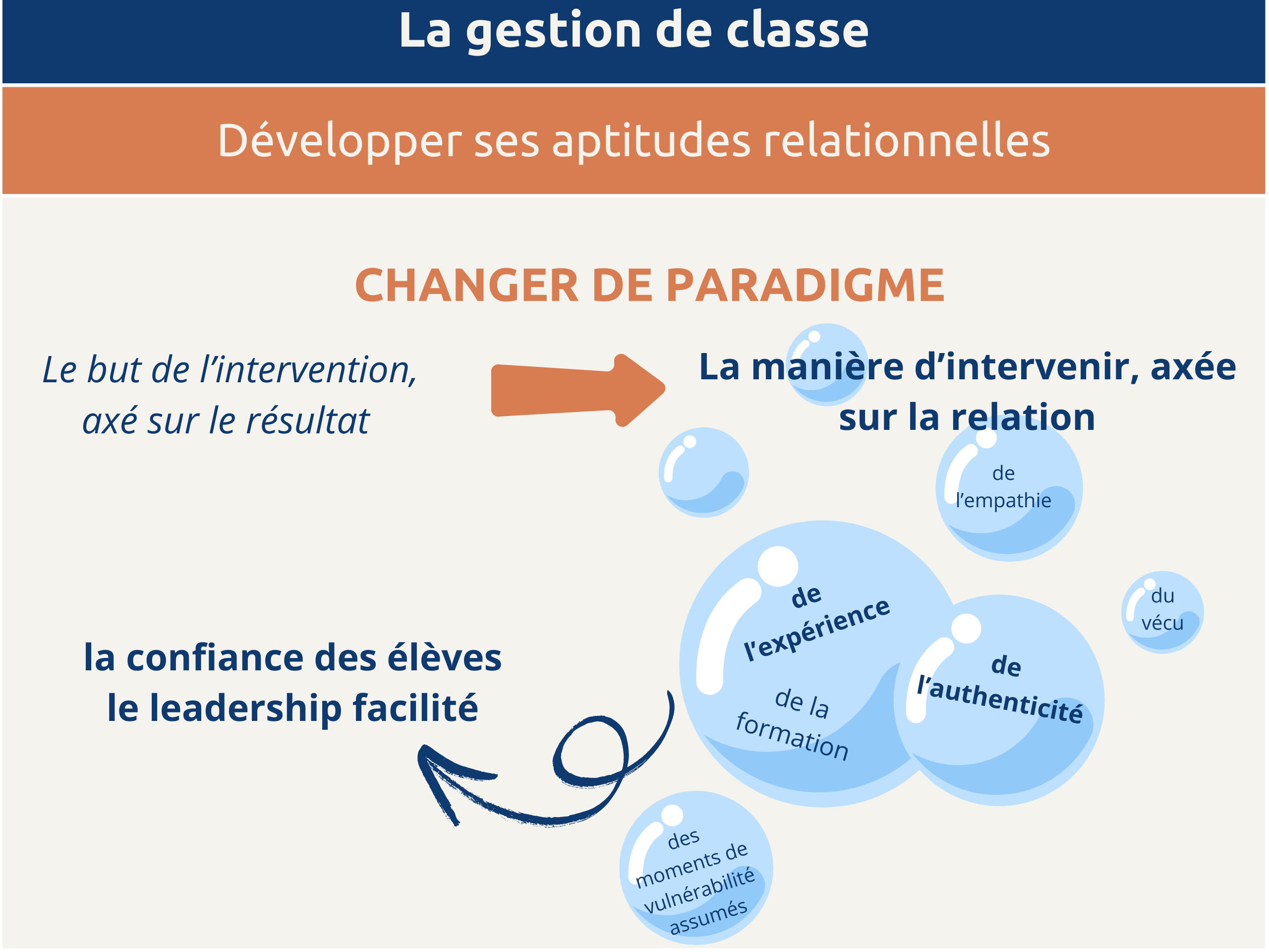 L’étude s’appuie sur le cadre théorique de deux auteurs danois, Juul et Jensen (2019) qui proposent un paradigme éducatif novateur. En effet, la compétence relationnelle est pour eux au cœur des compétences professionnelles enseignantes et ils soutiennent que le processus relationnel est l’assise sur laquelle la personne enseignante doit s’appuyer pour planifier et agir dans sa classe. Ce paradigme éducatif est révolutionnaire au Québec, car il propose de déplacer l’intérêt principal de la gestion relationnelle avec les élèves, où l’accent est actuellement mis sur les résultats des interventions éducatives, vers le processus relationnel avec lequel les interventions sont faites.