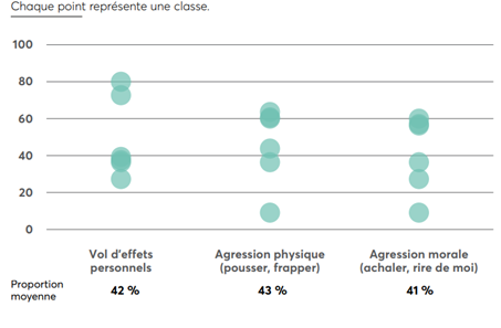 Les répondants du primaire, pour leur part, auraient une perception moyenne plutôt positive du climat relationnel, pédagogique et d’évaluation de leur classe. La perception du climat de justice et d’appartenance demeure assez similaire pour les 1er, 2e et 3e cycles. Par contre, au 3e cycle, c’est plus de la moitié des élèves qui témoignent d’un climat d’appartenance très positif. Finalement, au début du primaire, moins de la moitié des élèves rapportent au moins une forme d’agression. À la fin du primaire, il s’agit plutôt du quart des répondants.