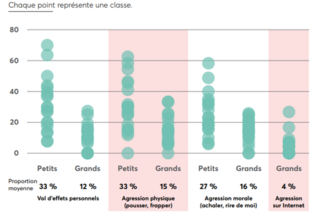 Les résultats de l’étude soulèvent d’abord que les élèves du préscolaire rapportent une perception très positive du climat relationnel et plutôt positive du climat pédagogique et de justice. Toutefois, la moitié des élèves de maternelle se disent d’accord avec l’affirmation qu’ils éprouvent une certaine peur de commettre des erreurs en classe. De plus, les deux tiers de ces élèves rapportent l’expérience d’au moins une forme d’agression par leurs pairs.