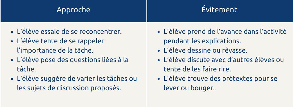 Un élève qui s’ennuie en classe peut adopter deux types de stratégies pour y faire face : les stratégies d’approche, qui le recentrent sur la tâche et favorisent son engagement, ou les stratégies d’évitement, qui lui permettent de fuir la situation jugée ennuyante (Nett et al., 2010 ; 2011). En voici quelques exemples :