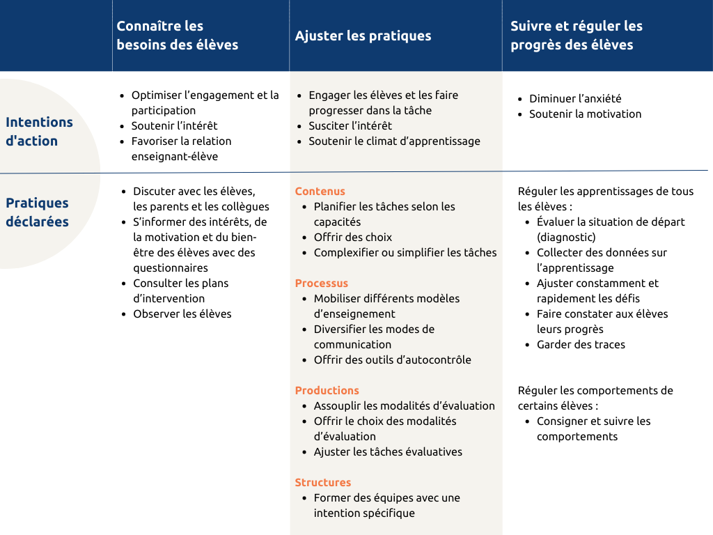 Synthèse des intentions d’action et des pratiques déclarées pour les trois dimensions conceptuelles de la différenciation pédagogique